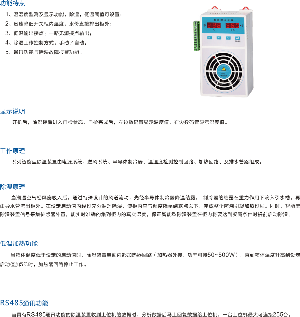智除濕裝置是用半導(dǎo)體制冷除濕方式,主動將密閉空間的潮濕空氣在風(fēng)扇的作用下吸入除濕風(fēng)道,空氣中的水汽經(jīng)過半號體制冷機構(gòu)后冷凝咸水,再通過導(dǎo)水管排出柜體,可以達(dá)到很好的除濕效果。通過減低空氣中含水量,使相對濕度和絕對濕度同時下降,幾乎不提高溫度,不產(chǎn)生溫差帶來的負(fù)面影響,從根本上杜絕或減少了事故的發(fā)生,也不會因高溫而加速柜內(nèi)器件及柜體的老化。智能型除溫裝置把被動防止凝露方式,改為主動引導(dǎo)凝露,有效的防止柜內(nèi)設(shè)備老化、絕緣強度降低、二次端子擊穿、材料霉變及鋼結(jié)構(gòu)件銹蝕等安全隱患,保證電網(wǎng)安全運行。